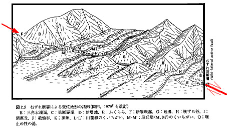 横ずれ地形 横ずれ尾根 横ずれ谷 閉塞丘 段丘崖の食い違い