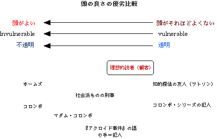 それでは以上を理想的読者に対する登場人物たちの頭の良さ優劣比較としてまとめてみましょう。次の表はVulnerability/Invulnerability、透明性/不透明性の基準も加えたものです。左へゆくにしたがって頭がよくなっています。 ![]() ワトソンよりホームズの方が頭がよいのは当たり前にしても、ワトソンが読者より劣るというのは自明のことでしょうか?ジャンルが想定する読者(「理想的読者」)を考えるならば、自明です。というのも、ワトソンは読者にカードを隠さないからです。読者はいわばワトソンの肩に乗って、ワトソンの頭越しに出来事を観察することができます。したがって、ワトソンより少し余計に眺望がきくのです。 社会派作品は一種のリアリズムをモットーとしますから、登場する刑事も現実生活をかかえた生身の人間だとされます。したがって試行錯誤を繰り返しますが、最終的には難問を解き明かします。ホームズほどではないにしても犯罪捜査には長けたプロの優秀さを示すわけです。 コロンボは常に完全犯罪と思われた犯罪のからくりを見破りますから、犯人より頭がよいのは当たり前でしょう。それでは表にあるコロンボとマダム・コロンボの比較はどうでしょう。知能検査をやったわけでもないのに、果たして二人の知能を比較できるものでしょうか。もちろん不可能です。ただ、明らかなことはコロンボは決して犯罪者に危害を加えられないが、マダム・コロンボはいつでもねらわれうる(vulnerable)ということです。それは男女の違いのせいではなく、カメラ・ワークの違いのせいです。コロンボはいつも見られる、それゆえ不透明な存在です。カメラ・ワークの主体(感じる眼差し)はあくまでも犯人なのです。観客は冒頭の殺害シーンからはじまって、一番多くの時間を犯人と過ごしますから、犯人についてはその心理にいたるまで多くの情報を得ます。反対にコロンボについての情報は極めて限定されます。彼が何を考え、何を感じているかを知るのは困難です。理想的読者にとってコロンボは神に近い存在となります。 マダム・コロンボの場合はこれと逆です。観客が彼女とともにいて彼女に同一化する(彼女の気持ちになる)からこそサスペンス(ワクワク、ハラハラ)が生じるわけです。探偵の頭の良さの違いというのは読者あるいは観客が探偵といっしょにいる度合い、探偵についての情報量の違いにもよります。コロンボが犯人よりも頭がよいように思えるのは彼が巧みにからくりを見破るからだけではなく、恐らくそれ以上にカメラの前でコロンボが不透明だからです。マダム・コロンボは彼女が夫に比べて透明な分だけ、知的には損することになります。アクロイド事件の犯人が理想的読者よりも頭がよいのは一見透明なようでいて、決定的な情報を読者に隠していたからにすぎません。 |