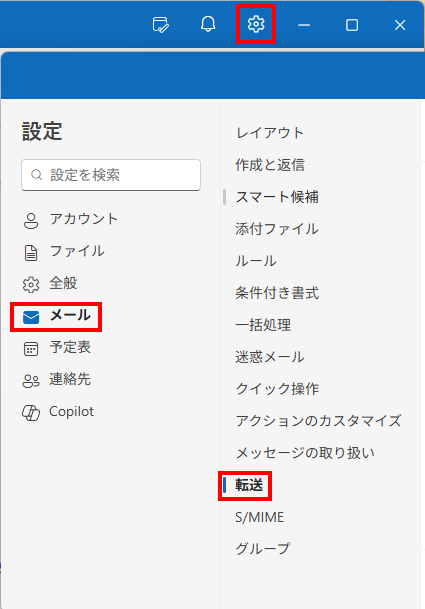 - 右上の歯車のボタンをクリックし、設定の「メール」→「転送」の順にクリック。