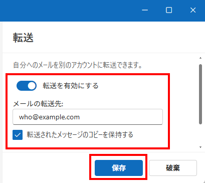 - 「転送を有効にする」を選択して、転送先のメールアドレスを入力する。