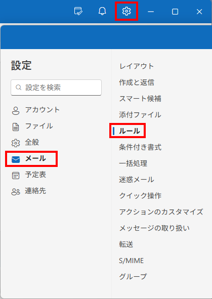 - 右上の歯車のボタンをクリックし、設定の「メール」→「ルール」の順にクリック。