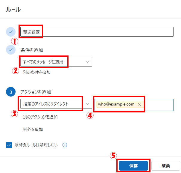 - 「条件を追加」の欄は「すべてのメッセージに適用」を選択します。