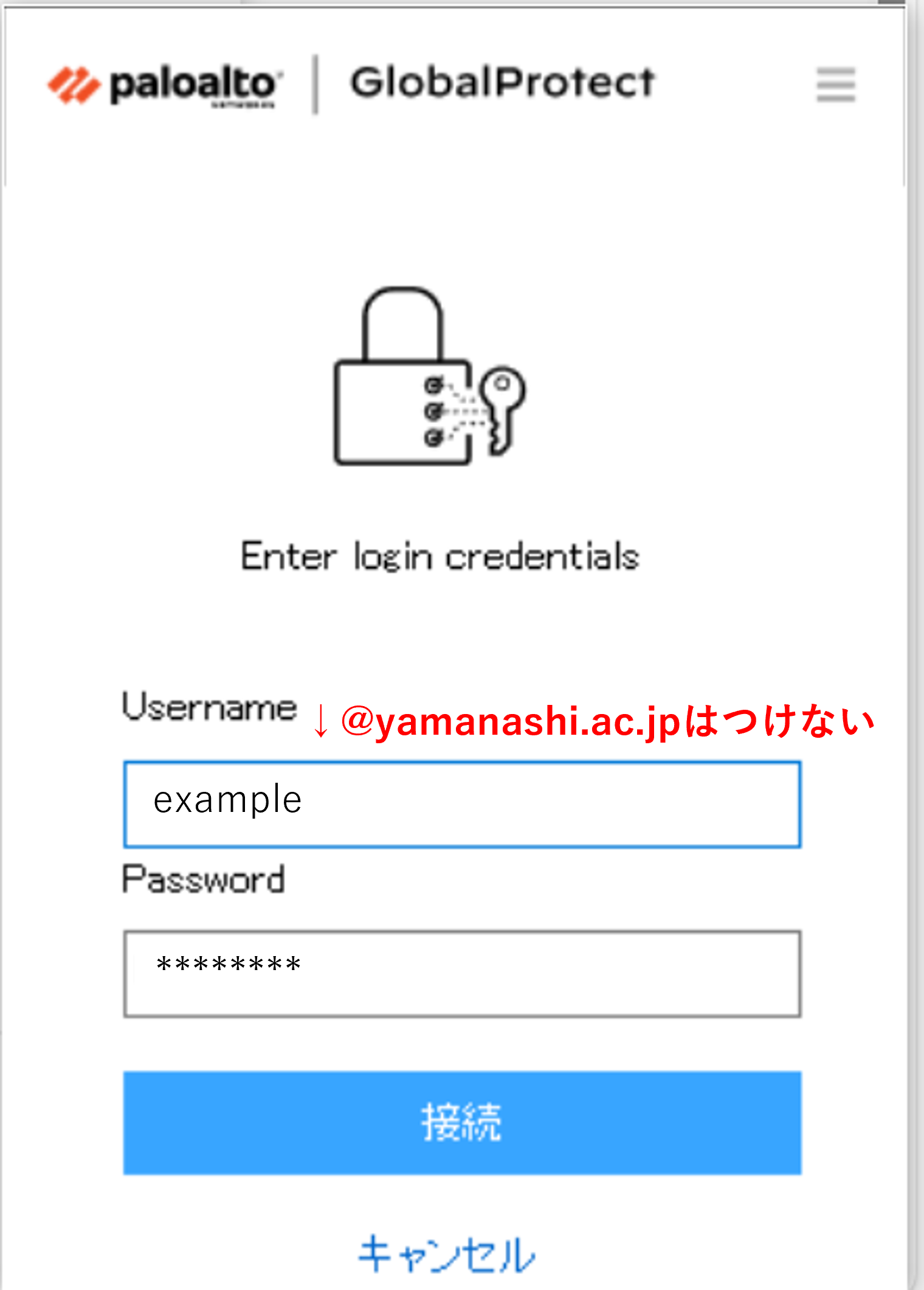 ※VPN接続時に統合認証のサインインの状態を維持すれば、このプロセスは以降スキップされます。 - GlobalProtectの画面に、ユーザ名(Username)、パスワード(Password)を入力し「接続」をクリックします。