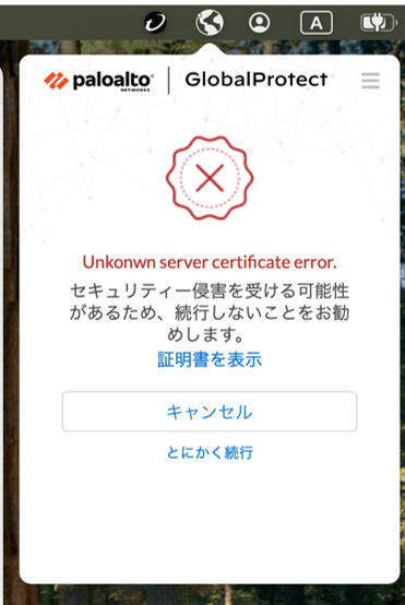 MacのGlobalProtectで以下の警告が出た場合は「とにかく続行」をクリックして接続に進んでください。