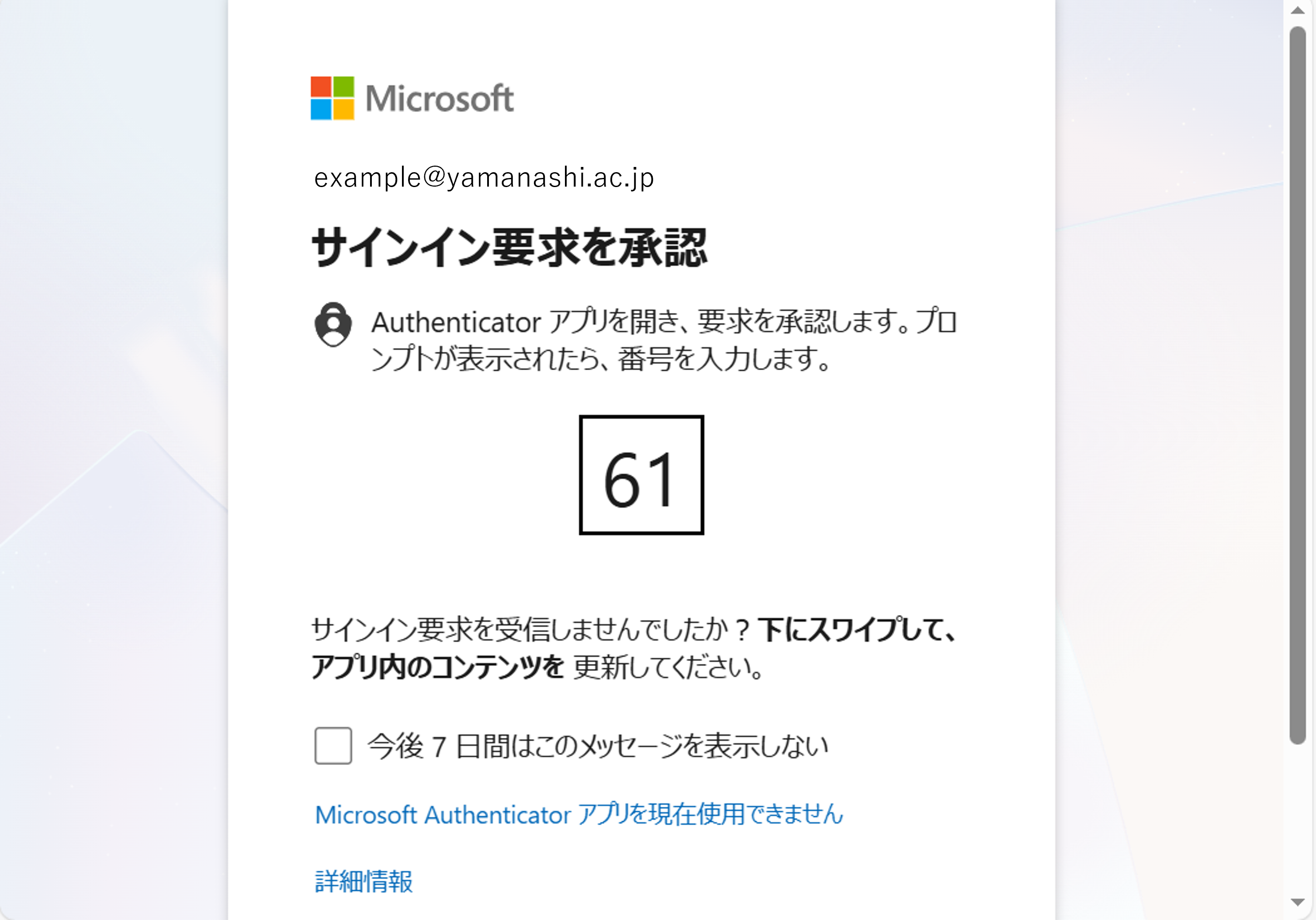- 多要素認証を要求された場合は、認証を行います。以下はAuthenticatorアプリへの要求の例です。