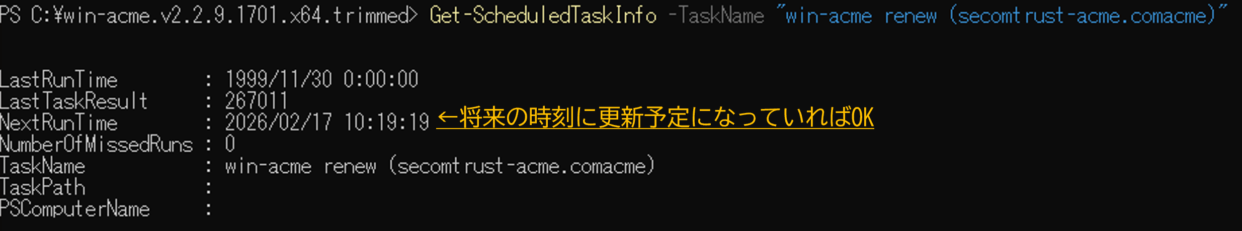 Get-ScheduledTaskInfo -TaskName "win-acme renew (secomtrust-acme.comacme)"